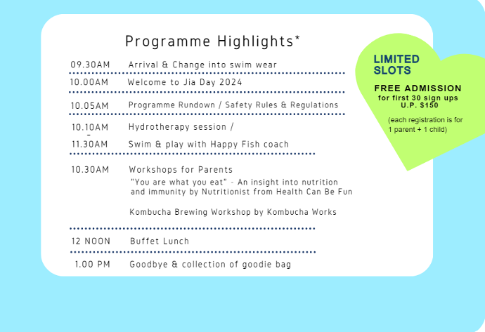 • Children under 5 years old are required to wear Happy Fish-approved swim diapers only (iPlay and SnuglyFit brands) and swim diapers can be purchased or loan (first come first served basis) on the day of the event at Happyfish.