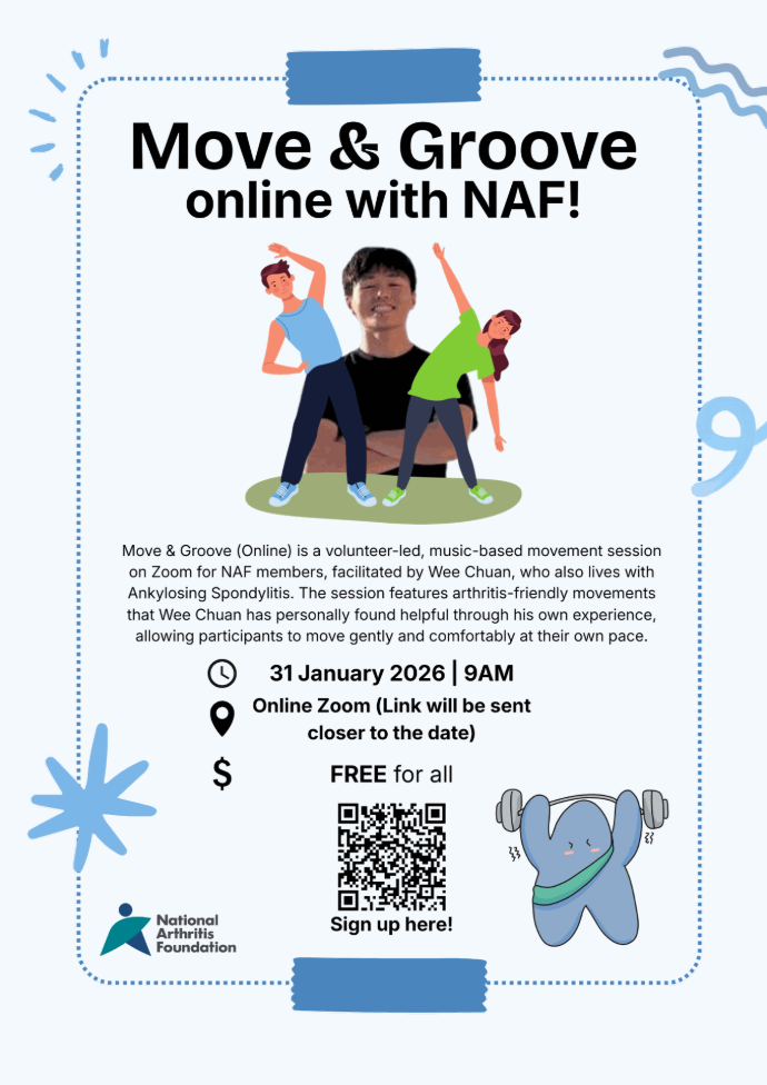 Move & Groove (Online) is a volunteer-led, music-based movement session conducted over Zoom and open to NAF members. The session is facilitated by Wee Chuan, a volunteer who also lives with Ankylosing Spondylitis, and is guided by his lived experience of staying active while managing his condition. The movements shared are arthritis-friendly and are ones that Wee Chuan has personally found helpful through his own experience, allowing participants to move gently, comfortably, and at their own pace. This session aims to create a supportive and encouraging space for members to enjoy light movement, connect with one another, and build confidence in staying active in a way that feels manageable and safe.